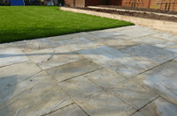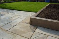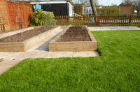 Gallery Page Six. A contemporary Garden design with both a large lawn and paved area combined with large raised beds. Please click on any of the images to enlarge